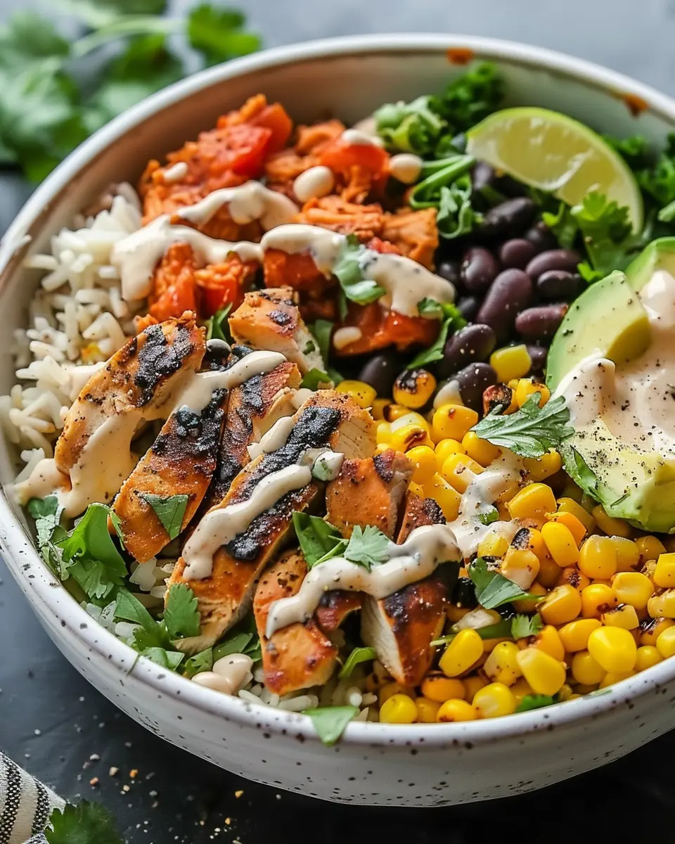 PrintChipotle Chicken Bowl Delight with Black Beans, Corn & Creamy Sauce