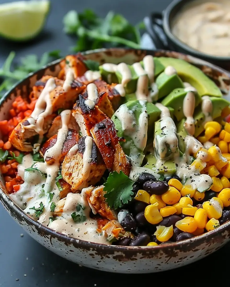 A delicious Chipotle Chicken Bowl featuring black beans, corn, and a creamy sauce that’s perfect for any meal.