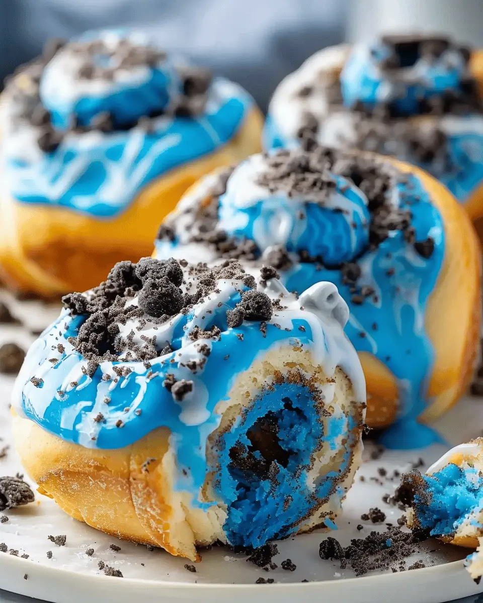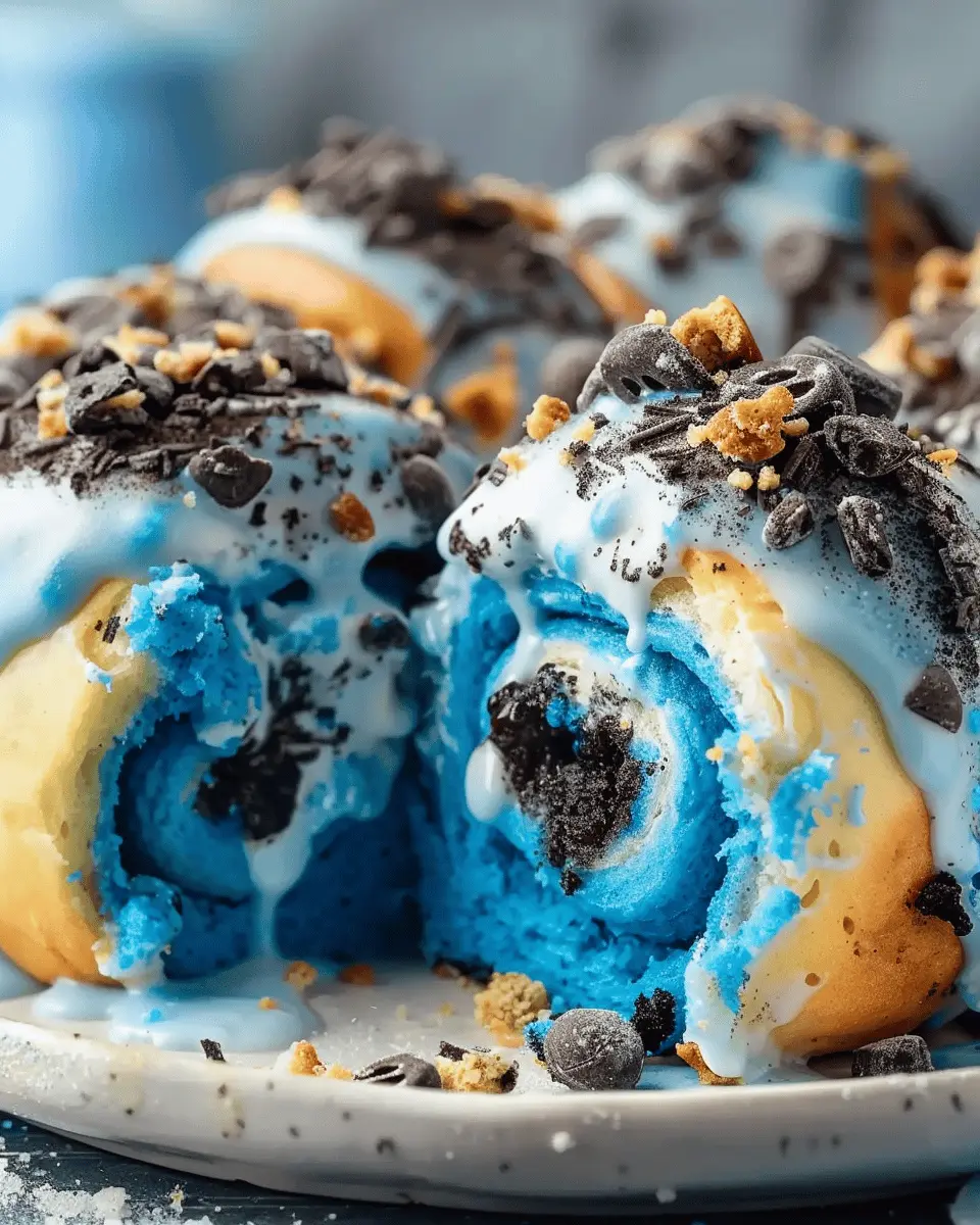 Indulge in these stunning Cookie Monster Cinnamon Rolls with vibrant blue dough and delicious cookie crumbles. Perfect for a unique treat!