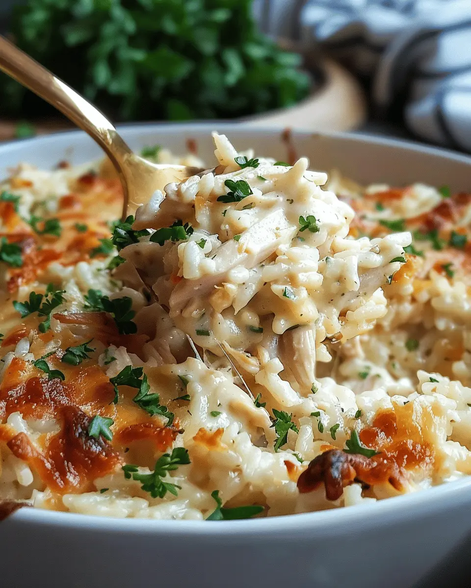 Presentation is key! Try serving your Dump-and-Bake Chicken Alfredo Rice Casserole in individual ramekins for a more refined touch. Alternatively, sprinkle fresh herbs or a drizzle of olive oil on top before serving to elevate the look. For a fun twist, pair it with chicken ham or turkey bacon on the side for added flavor.