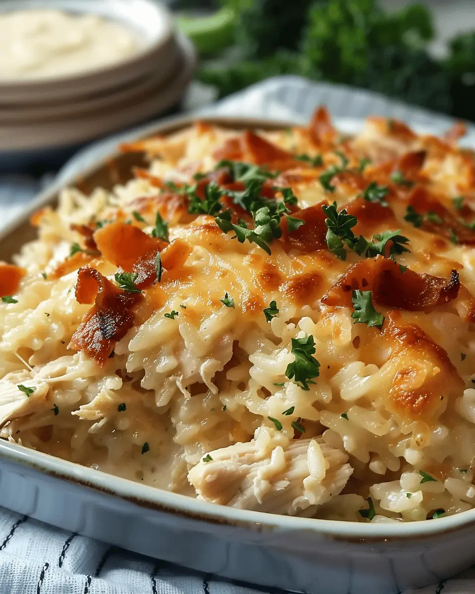 A creamy and savory recipe that combines chicken, rice, and turkey bacon in a delectable casserole.