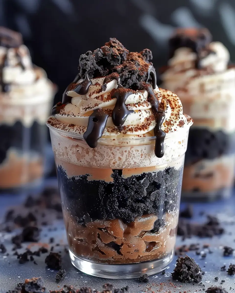 A delightful dessert that combines chocolate cake, pudding, and crushed cookies for a spooky twist on traditional dirt cake.