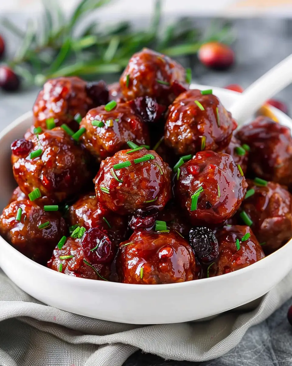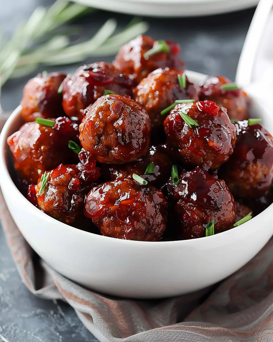 Delightful turkey bacon meatballs glazed with a zesty cranberry sauce, perfect for festive gatherings.
